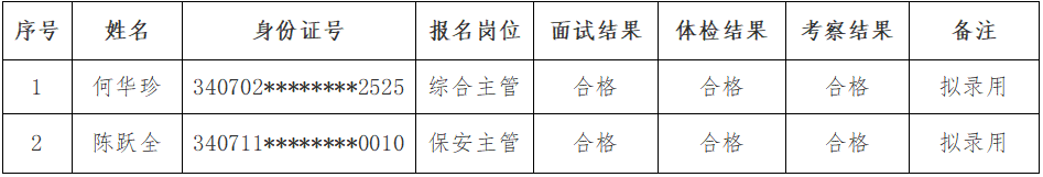 銅陵保祥城市服務有限公司擬錄用人員名單